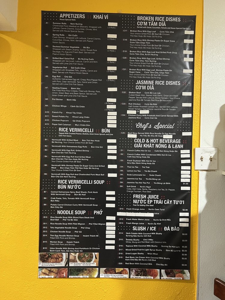 Vietnam Bistro in Chico, CA offers a variety of Vietnamese dishes with options like Rice Vermicelli Soup, Bún Nước, and Potato Carrot Chicken Curry. The menu includes appetizers like Chicken Popcorn, Spring Rolls, and Sauteed Summer Vegetables. The rice vermicelli dishes feature combinations like Vermicelli with Grilled Shrimp and Vermicelli with Vietnamese Egg Rolls. The restaurant provides a casual dining experience with options for outdoor seating, catering services, and waiter service. With a diverse menu that includes vegan and vegetarian options, Vietnam Bistro is a great choice for groups, families, or a quick lunch or dinner. Their gender-neutral restrooms, Wi-Fi access, and alcohol options create a welcoming and inclusive environment for all diners. Overall, Vietnam Bistro offers a delightful culinary experience with a wide range of flavorful Vietnamese dishes.